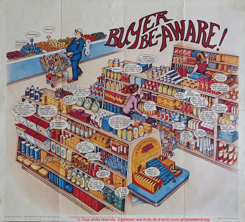 Cette affiche est une réelle mise en garde à l’attention des consommateurs, à travers l’image du supermarché et des tentations de la surconsommation. On y voit les produits eux-mêmes donner des conseils et des avertissements incitant le client à mieux consommer et à ne pas se laisser berner par les prix, le marketing et le packaging. Des thématiques comme le recyclage sont également abordées. L’usage de l’humour facilite la transmission et l’assimilation du message.