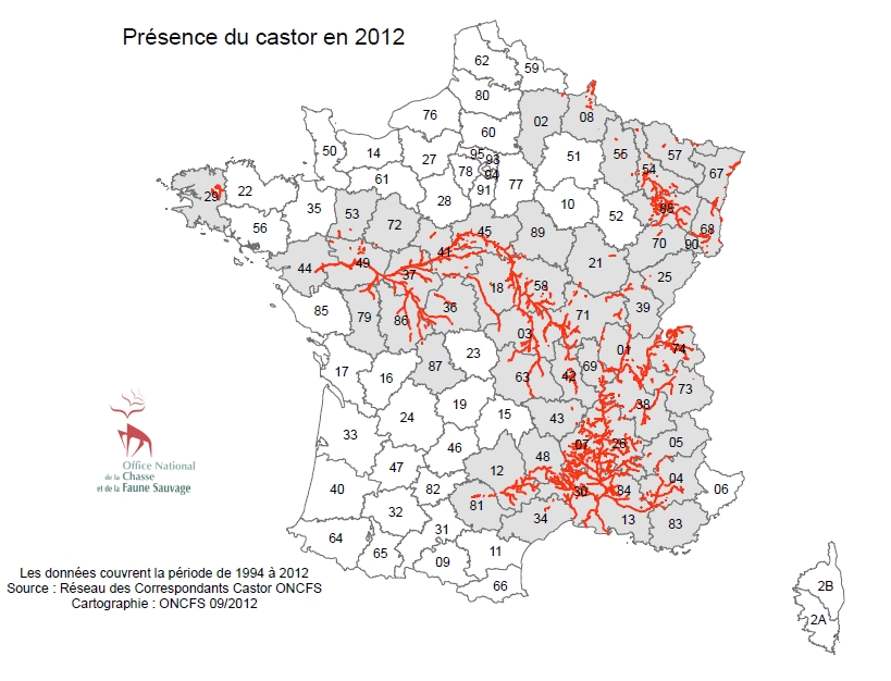 À l’Office national de la chasse et de la faune sauvage, le réseau castor a été crée en 1987 suite à une circulaire du ministère en charge de l’environnement. D’après les données de l’ONCFS, il ne restait que 7 sujets en 1937. Grâce aux mesures de protection et de réintroduction, l’effectif est remonté à 2 000 en 1989, avec une répartition diffuse dans 50 départements. En 2010, l’effectif est estimé à 14 000 individus.