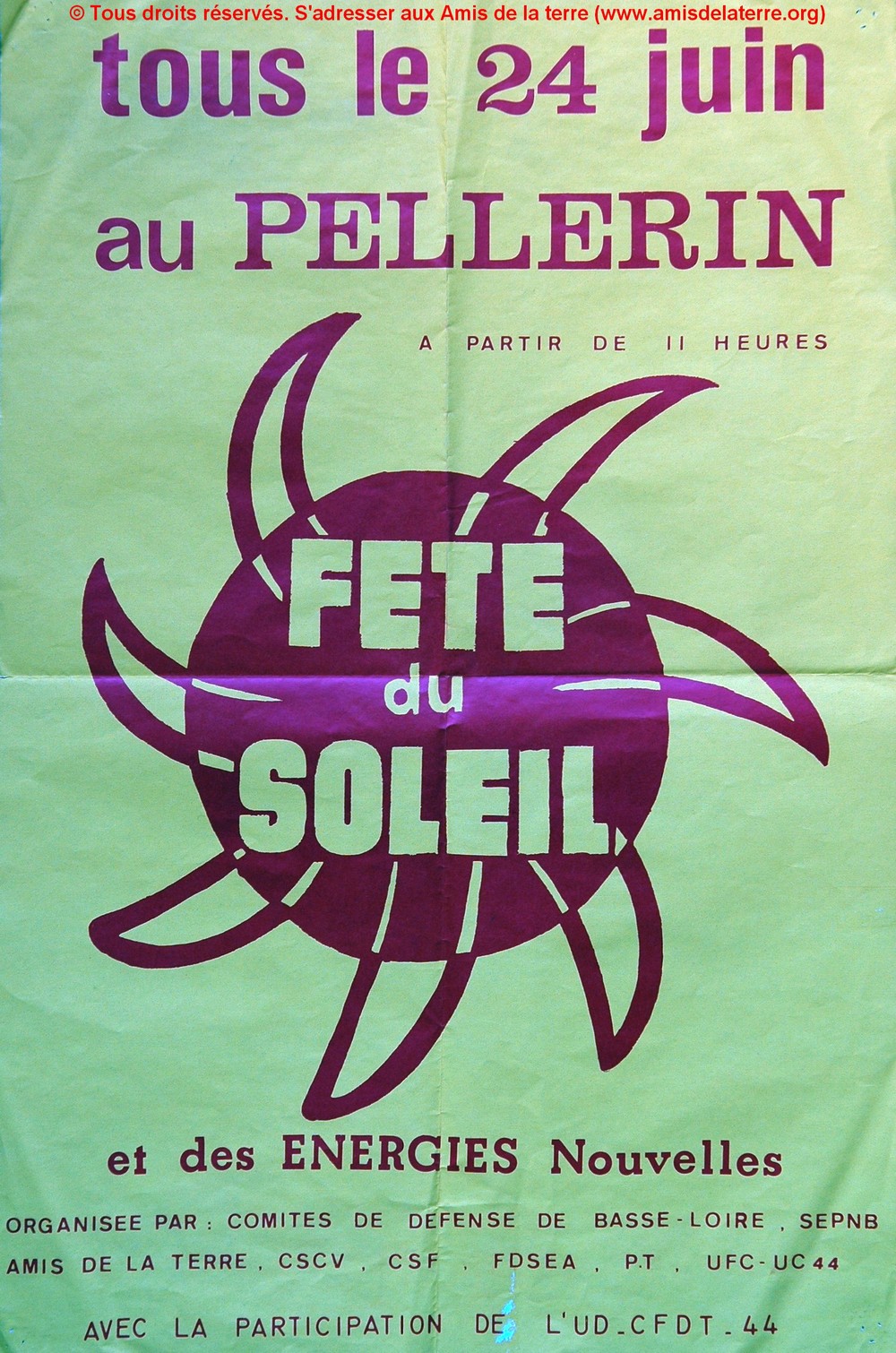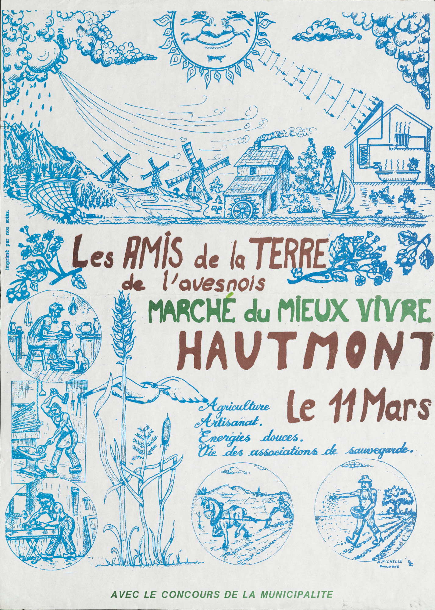Sur cette affiche, l’association promeut l’usage d’énergies considérées douces en comparaison avec l’énergie fossile et nucléaire : le solaire, l’éolien, les moulins à eau ou encore la force animale dans les champs.