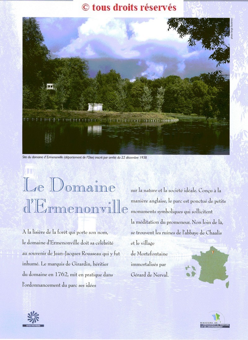| 20060546/5 « Le domaine/d’Ermenonville/[...] », Parimage (Ed.), [1999], photo de Serge Sautereau, [vue du Domaine d’Ermenonville dans l’Oise, plus logo], 1 ex., 40 x 30 cm, couleur. |