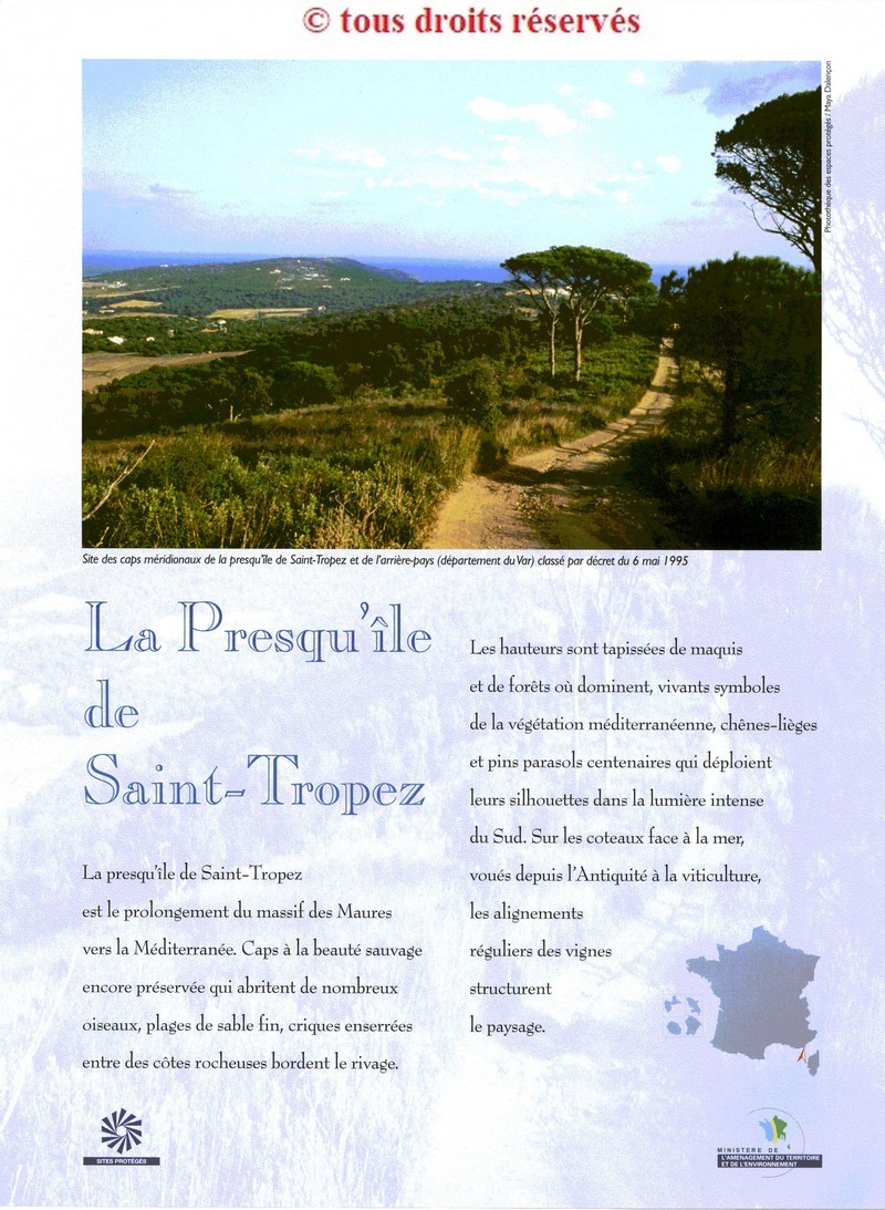 | 20060546/23 « La Presqu’île/de/Saint-Tropez/[...] », v (Ed.), [1999], photo de Maya Dalençon et de la Photothèque des espaces protégés, [vue des caps méridionaux de la presqu’île de Saint-Tropez et de son arrière-pays dans le Var, plus logo], 1 ex., 40 x 30 cm, couleur. |