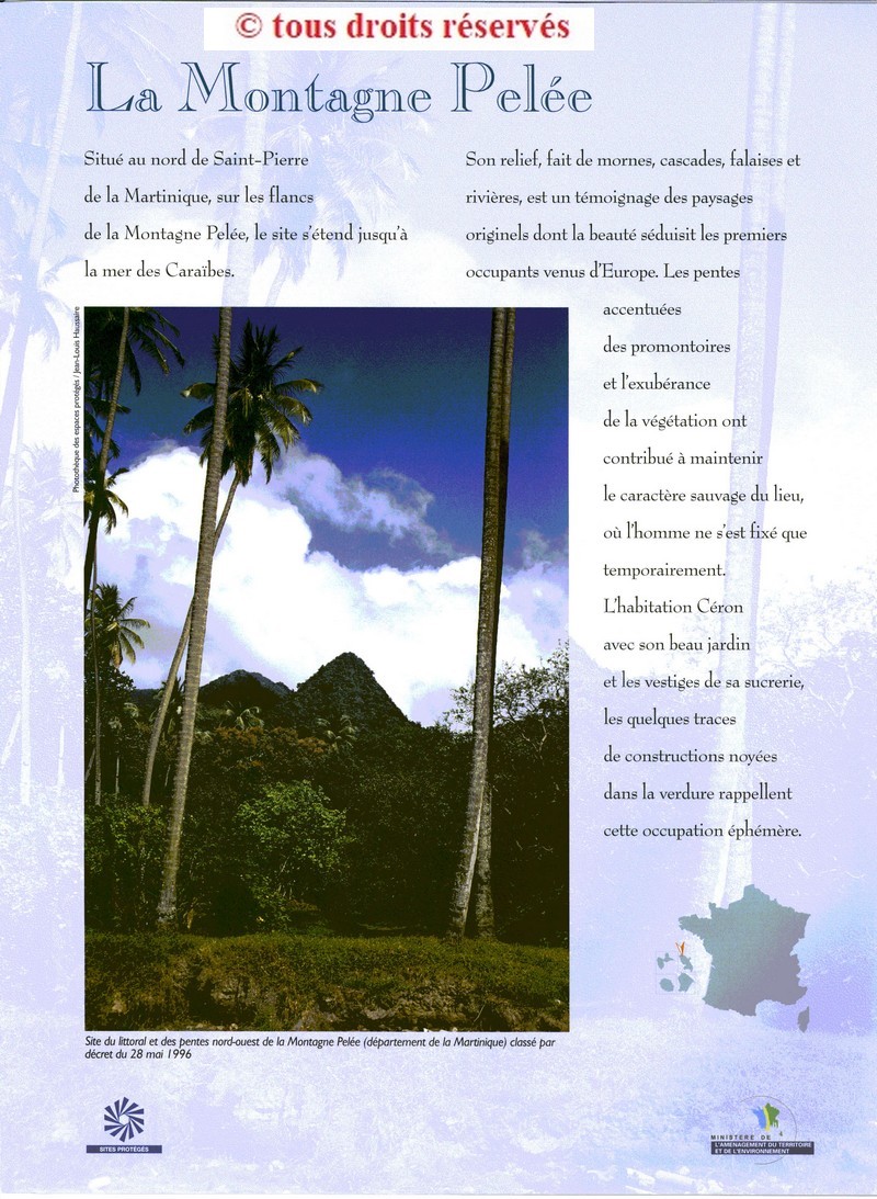 20060546/28 « La Montagne Pelée/[...] », Parimage (Ed.), [1999], photo de Jean-Louis Haussaire et de la Photothèque des espaces protégés, [vue du littoral et des pentes nord-ouest de la Montagne Pelée en Martinique, plus logo], 1 ex., 40 x 30 cm, couleur. |