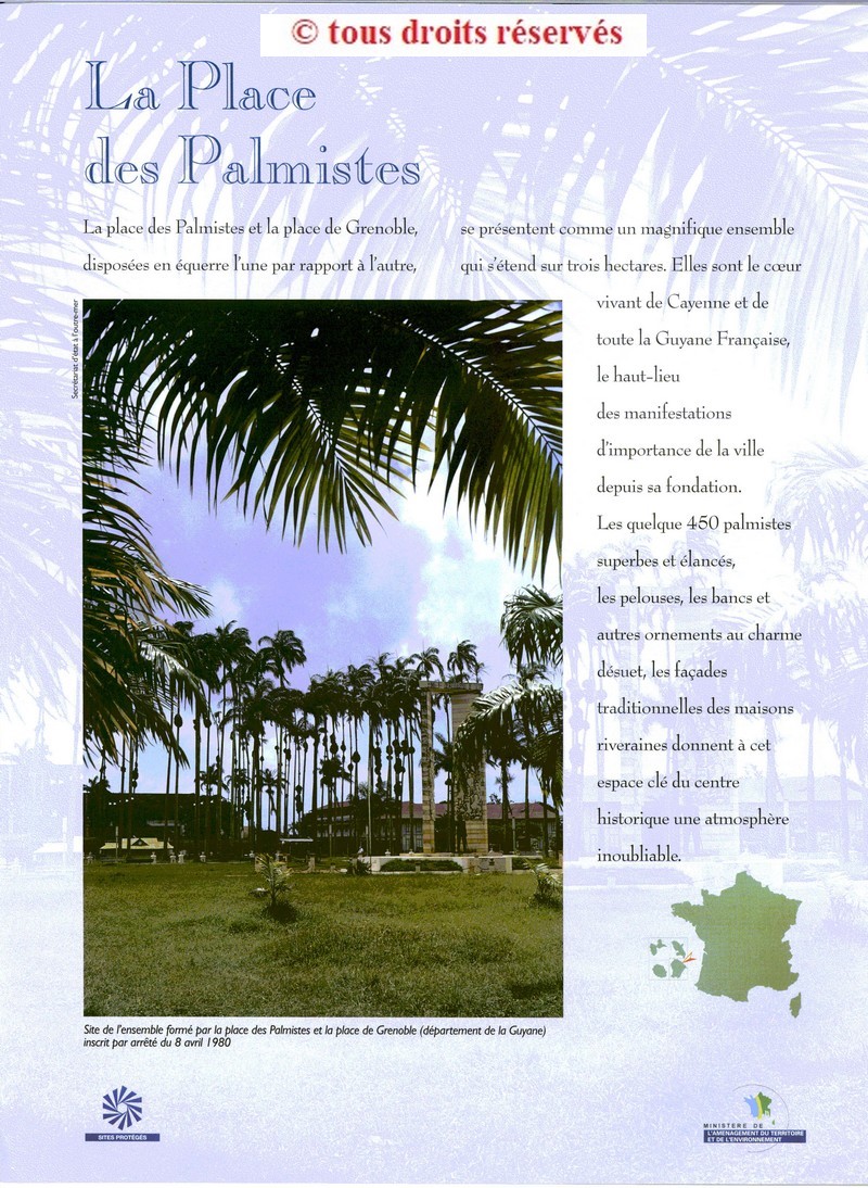 | 20060546/29 « La Place des Palmistes/[...] », Parimage (Ed.), [1999], photo du Secrétariat d’État à l’Outre-Mer, [vue de l’ensemble formé par la place des Palmistes et la place de Grenoble en Guyane, plus logo], 1 ex., 40 x 30 cm, couleur. |