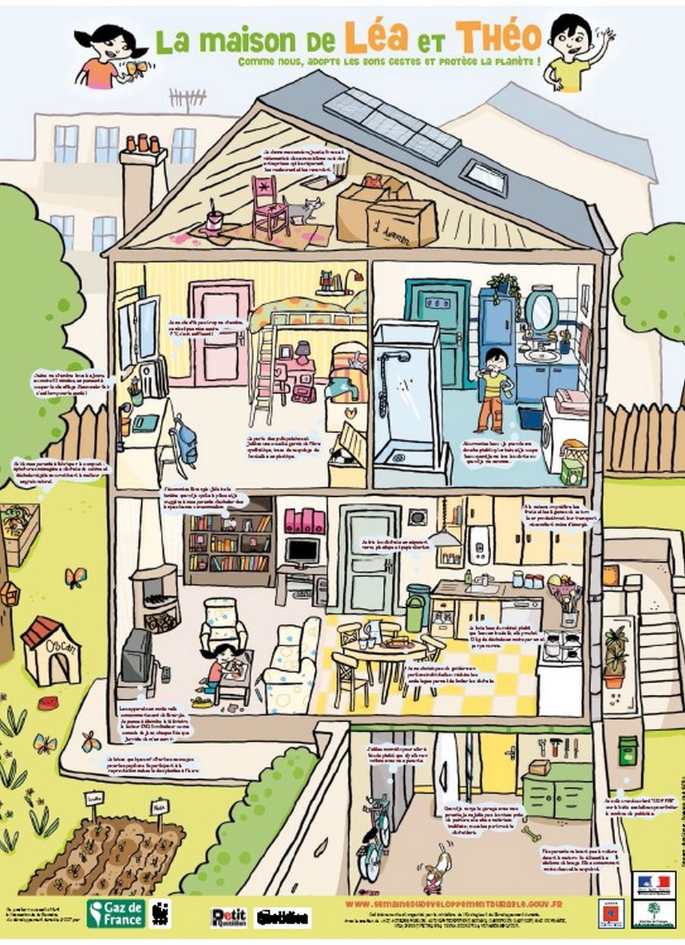 « La maison de Léa et Théo - comme nous, adopte les bons gestes et protège la planète ! », illustration Mado Seiffert, Ministère de l’écologie et du développement durable, Agence de l’environnement et de la maîtrise de l’énergie (ADEME), 60x80 cm, couleur, 2007