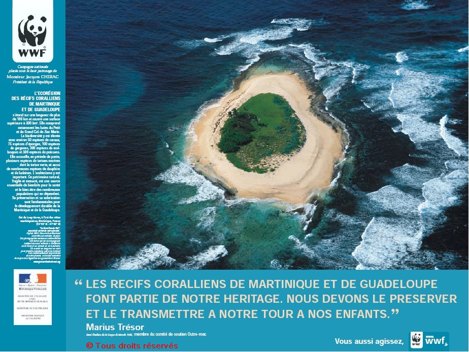 « L’écorégion des récifs coralliens de la Martinique et de la Guadeloupe - " Les récifs coralliens de la Martinique et de la Guadeloupe font partie de notre héritage. Nous devons le préserver et le transmettre à notre tour à nos enfants.", Marius Trésor, Demi finaliste de la Coupe du Monde 1982, membre du comité de soutien Outre-mer », 60x80 cm, couleur, 2004