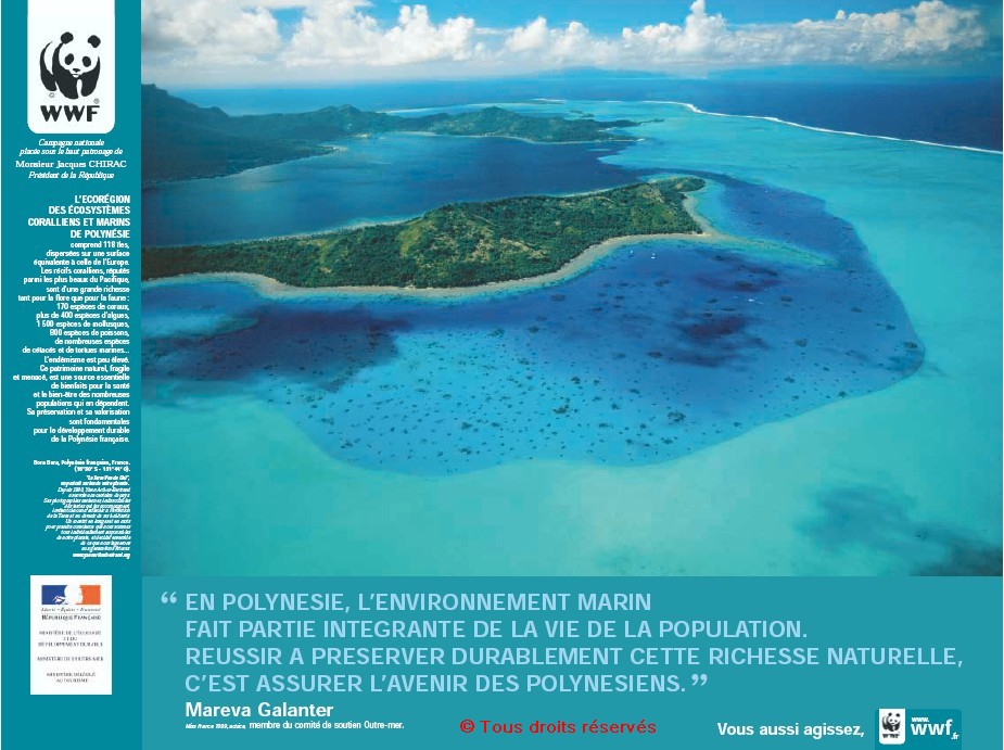 «  L’écorégion des écosystèmes coralliens et marins de Polynésie - " En Polynésie, l’environnement marin fait partie intégrante de la vie de la population. Réussir à préserver durablement cette richesse naturelle, c’est assurer l’avenir des Polynésiens. ", Mareva Galanter, miss France 1999, actrice, membre du comité de soutien Outre-mer », 60x80 cm, couleur, 2004