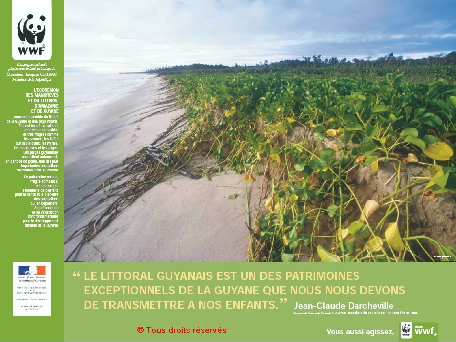« L’écorégion des mangroves et du littoral d’Amazonie et de Guyane - " Le littoral guyanais est un des patrimoines exceptionnels de la Guyane que nous nous devons de transmettre à nos enfants. ", Jean-Claude Darcheville, vainqueur de la coupe de France 2002, membre du comité de soutien Outre-mer », 60x80 cm, couleur, 2004