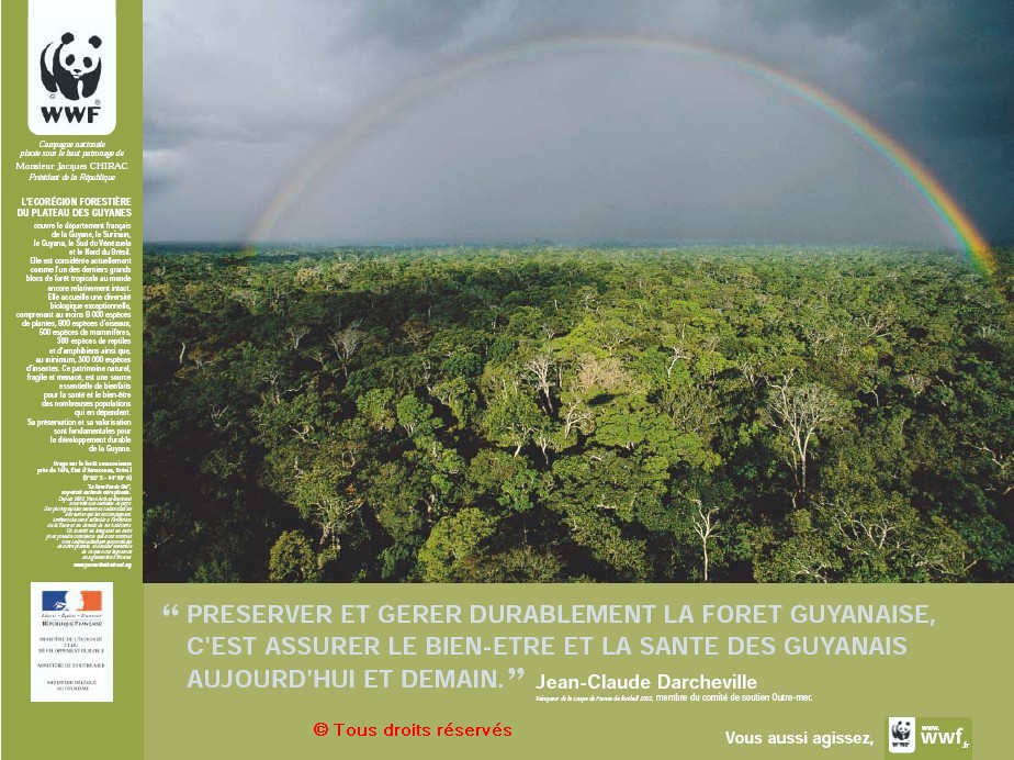 «  L’écorégion forestière des plateaux des Guyanes - " Préserver et gérer durablement la forêt guyanaise, c’est assurer le bien-être et la santé des Guyanais aujourd’hui et demain. ", Jean-Claude Darcheville, vainqueur de la coupe de France 2002, membre du comité de soutien Outre-mer », 60x80 cm, couleur, 2004