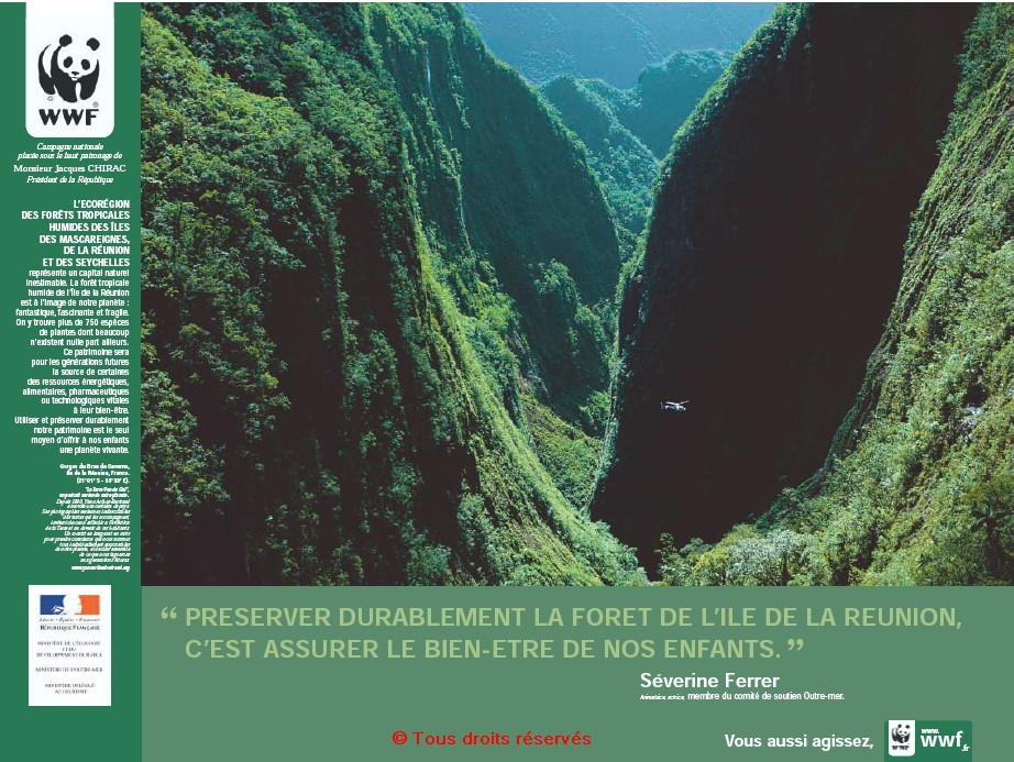 « L’écorégion des forêts tropicales humides des îles des Mascareignes, de la Réunion et des Seychelles - " Préserver durablement la forêt de l’île de la Réunion, c’est assurer le bien-être de nos enfants. ", Séverine Ferrer, animatrice, actrice, membre du comité de soutien Outre-mer », 60x80 cm, couleur, 2004
