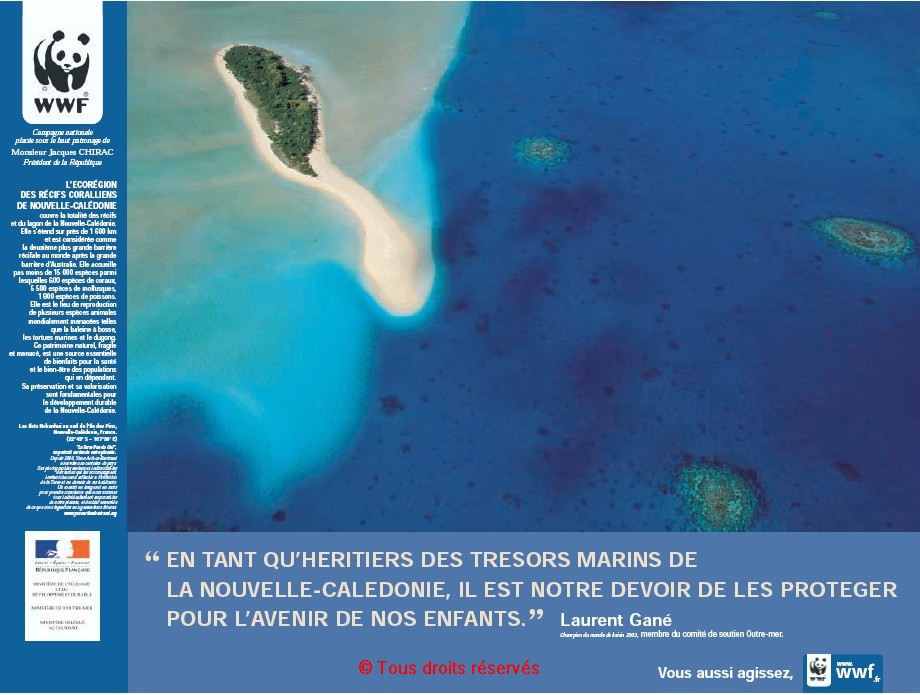 «  L’écorégion des récifs coralliens de Nouvelle-Calédonie - " En tant qu’héritiers des trésors marins de la Nouvelle-Calédonie, il est de notre devoir de les protéger pour l’avenir de nos enfants. ", Laurent Gané, champion du monde de keirin 2003, membre du comité de soutien Outre-mer », 60x80 cm, couleur, 2004