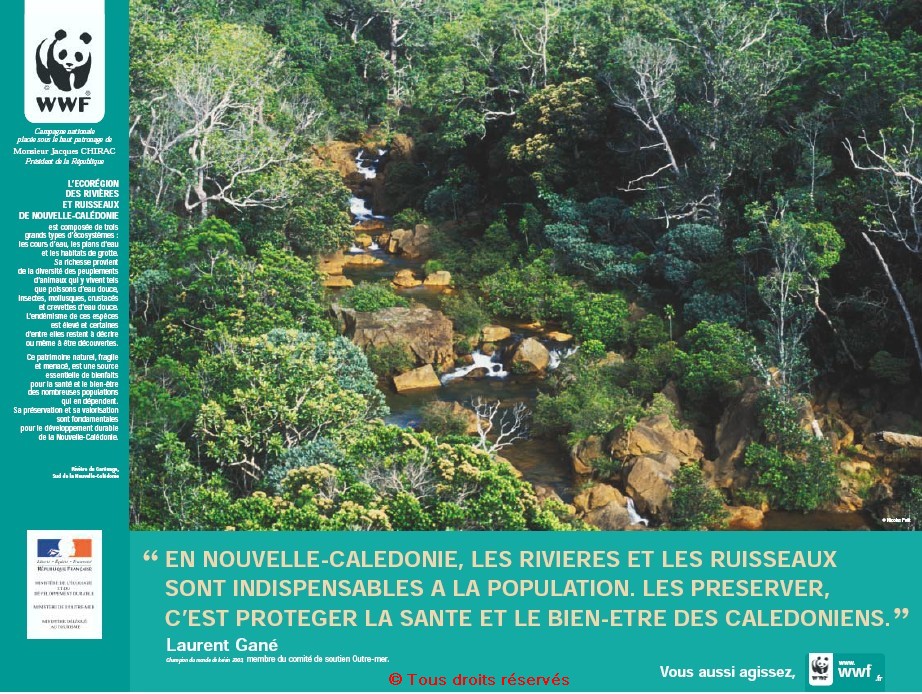 « L’écorégion des rivières et ruisseaux de Nouvelle-Calédonie - " En Nouvelle-Calédonie, les rivières et les ruisseaux sont indispensables à la population. Les préserver, c’est protéger la santé et le bien-être des Calédoniens. ", Laurent Gané, champion du monde de keirin 2003, membre du comité de soutien Outre-mer », 60x80 cm, couleur, 2004