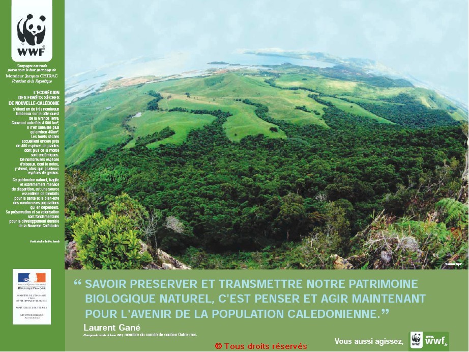 « L’écorégion des forêts sèches de Nouvelle-Calédonie - " Savoir préserver et transmettre notre patrimoine biologique naturel, c’est penser et agir maintenant pour l’avenir de la population calédonienne. ", Laurent Gané, champion du monde de keirin 2003, membre du comité de soutien Outre-mer », 60x80 cm, couleur, 2004