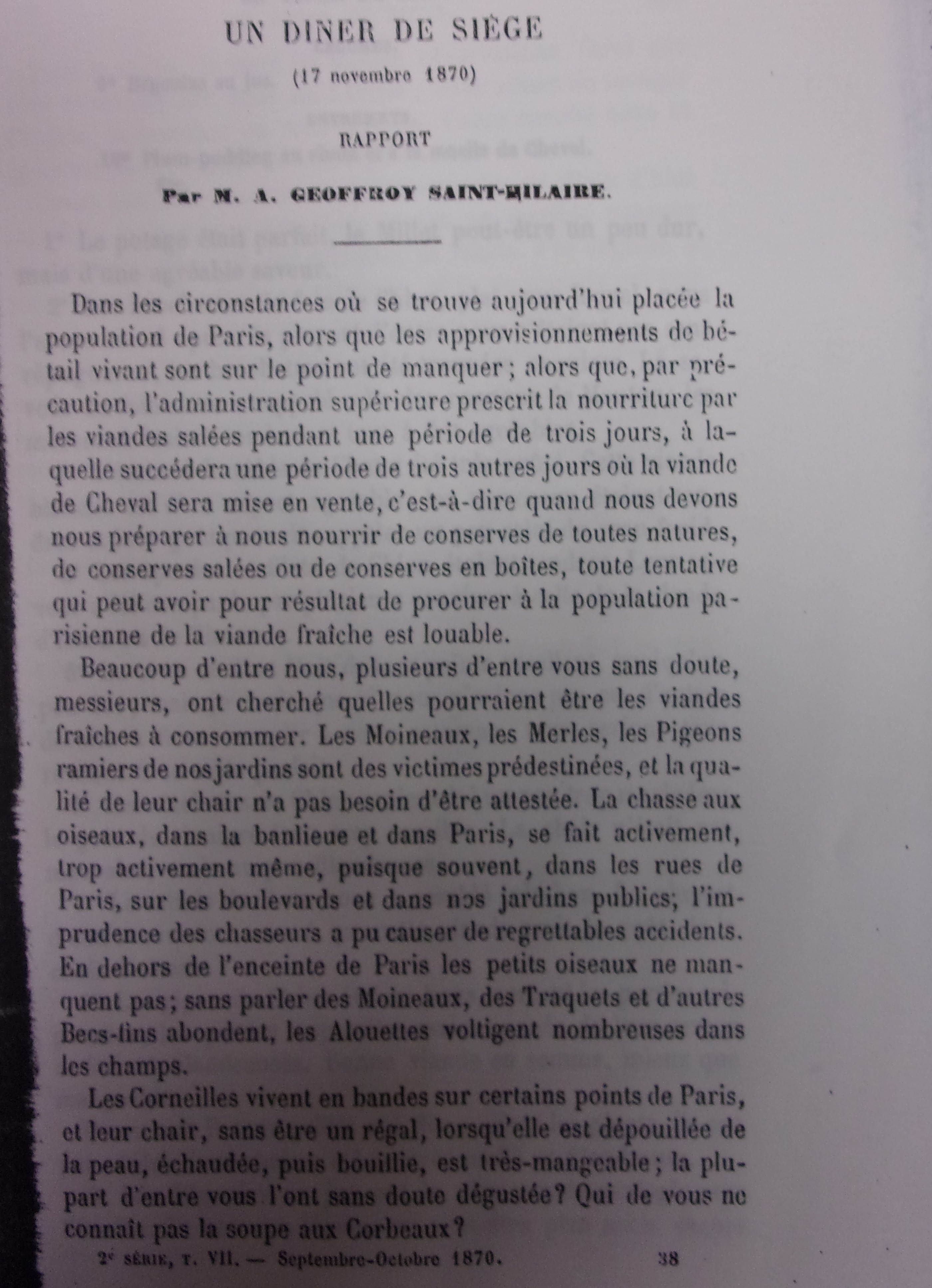 Société nationale d’acclimatation : un dîner du siège, rapport, 1870